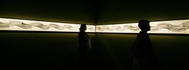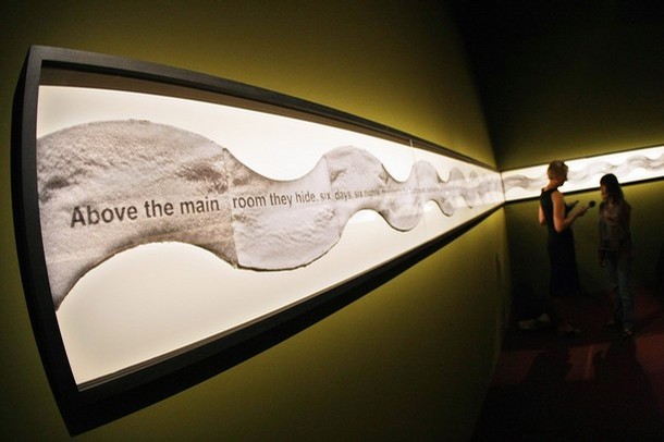VO: The words sound like simple but brutal reportage, while the visual sound-wave like pattern invites a variety of associations - give and take, positive and negative, ebb and flow, kindness and cruelty, tragedy and miracle - that seem interchangeably appropriate. The text is based on the true story of an 18 month old Kosovar Albanian boy who is mistakenly left for dead, rescued and given a name by Serbs, later cared for and renamed by Albanians, and was finally reuinited with his parents after the NATO occupation in 1999. VO: Mea Culpa is reminiscent of Kelly's past focus on everyday processes and on the experience of women, both of which characterized her groundbreaking work of the '70s Moreover, Kelly used lint as the medium of art, a material associated with laundry, the everyday domestic labor of women. Each cycle thins out the fabric ever so slightly until, like the victims and their stories, they have become so worn as to be discarded.