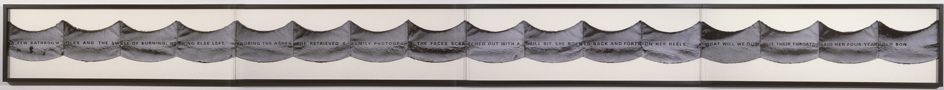 Mea Culpa, 1999 VO: Mea Culpa ("I am guilty") is an installation consisting of four 16 to 20 foot panels of curved, ocean wave shaped sections of lint with superimposed text. To make Mea Culpa, Kelly fitted a clothes dryer's filter screen with letters, which were gradually embossed onto the lint that filled the screen as Kelly washed her own black and white clothing.
