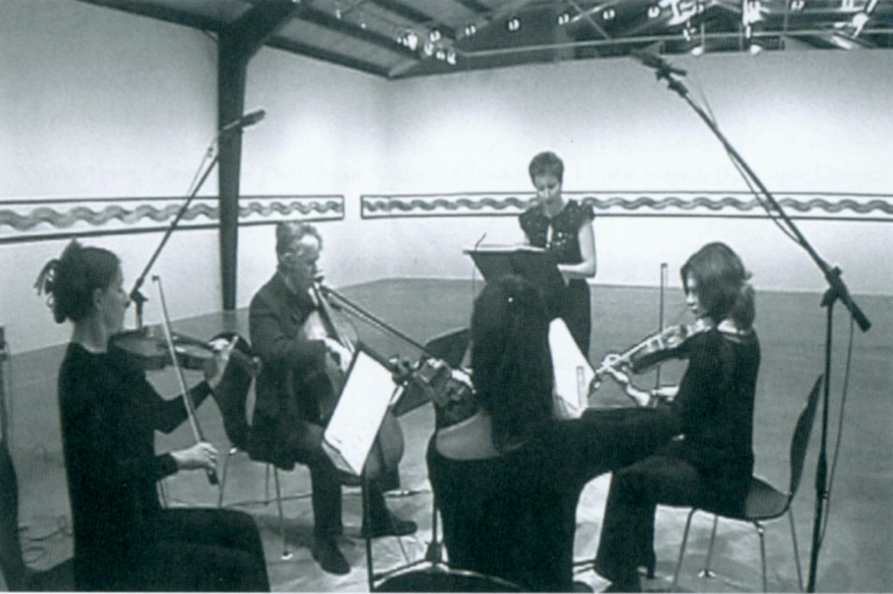 VO: The artist based her texts on media accounts of documented military atrocities in Cambodia and Sarajevo, Palestine and South Africa. With an immediate sense of material and process, it suggested a central resonant metaphor; A woman repeatedly washing and rewashing mourning clothes without being able to cleanse them of histories woven indelibly into their fabric. VO: Composer Michael Nymon composed a score for Gloria Patri that was performed live at the opening, and played as a soundtrack during the duration of the show